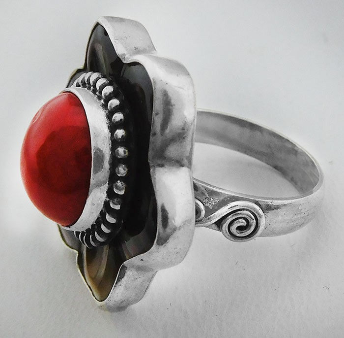 Vintage .925 Sterling Silver Abalone Shell & Coral Ring